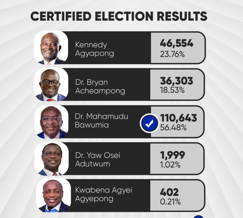 Former Assin Central Member of Parliament, Kennedy Ohene Agyapong, placed second with 46,554 votes, representing 23.76 per cent. He was followed by former Minister for Food and Agriculture, Dr Bryan Acheampong, who secured 36,303 votes, equivalent to 18.53 per cent.
