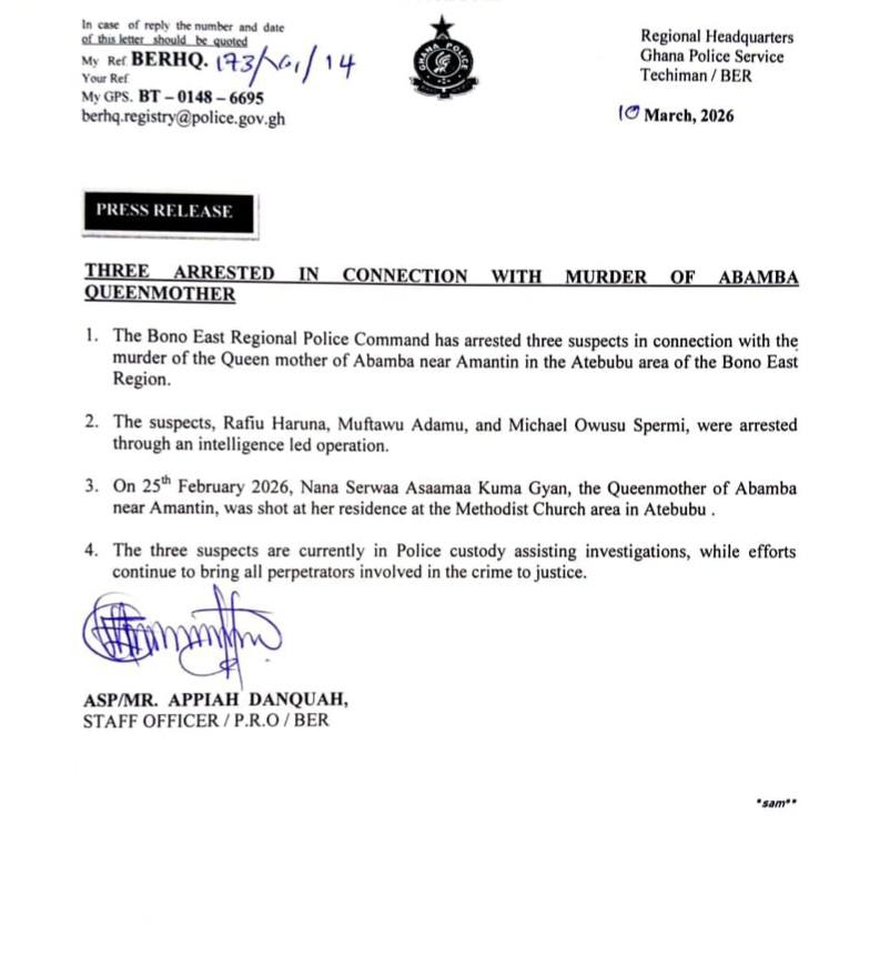 The Bono East Regional Police Command has arrested three suspects in connection with the killing of the Queenmother of Abamba, Nana Serwaa Asaamaa Kuma Gyan, near Amantin in the Atebubu area.